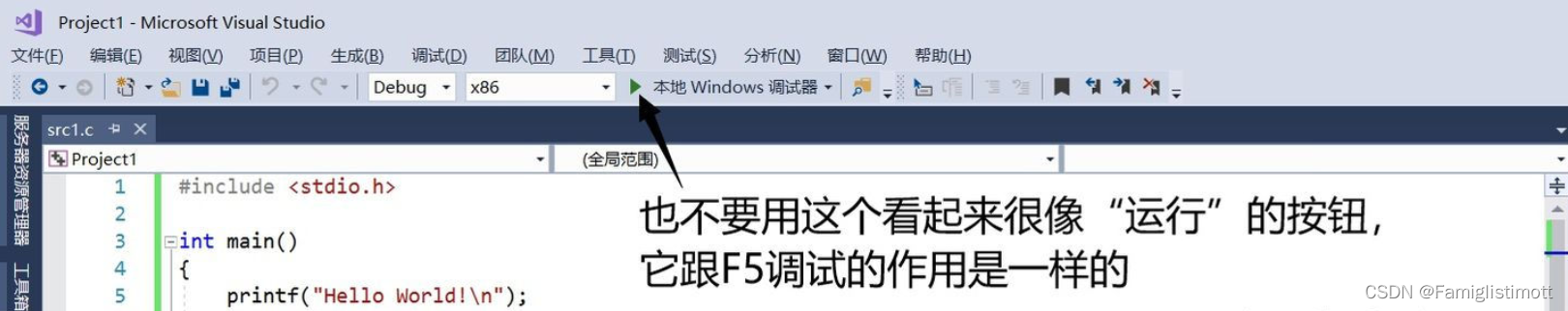 注意,如果你尚未生成目标程序而直接选择执行,VS将自动替你完成生成的步骤,也就是说前面生成解决方案的步骤是可以省略的。但作为教程这里还是加以介绍,希望读者明白其中包含的基本过程。