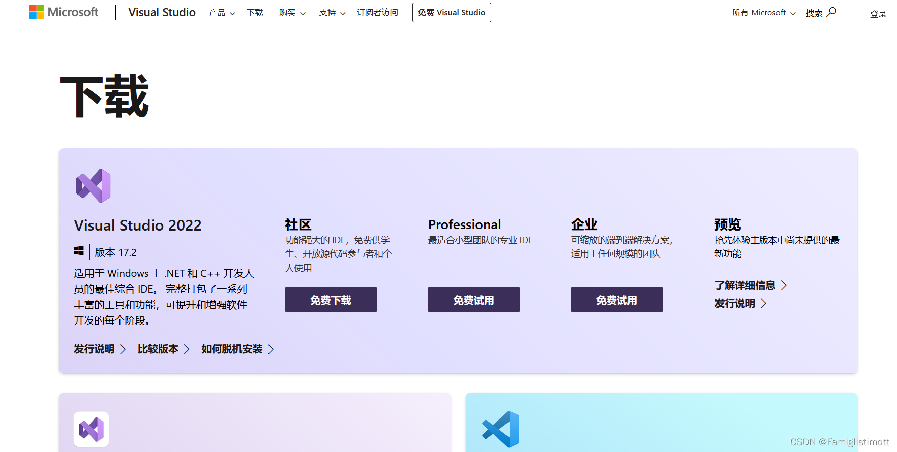 在这个页面上只有最新版本(目前是VS 2022)可供下载。如果想下载旧版本(如2017、2015等),请访问