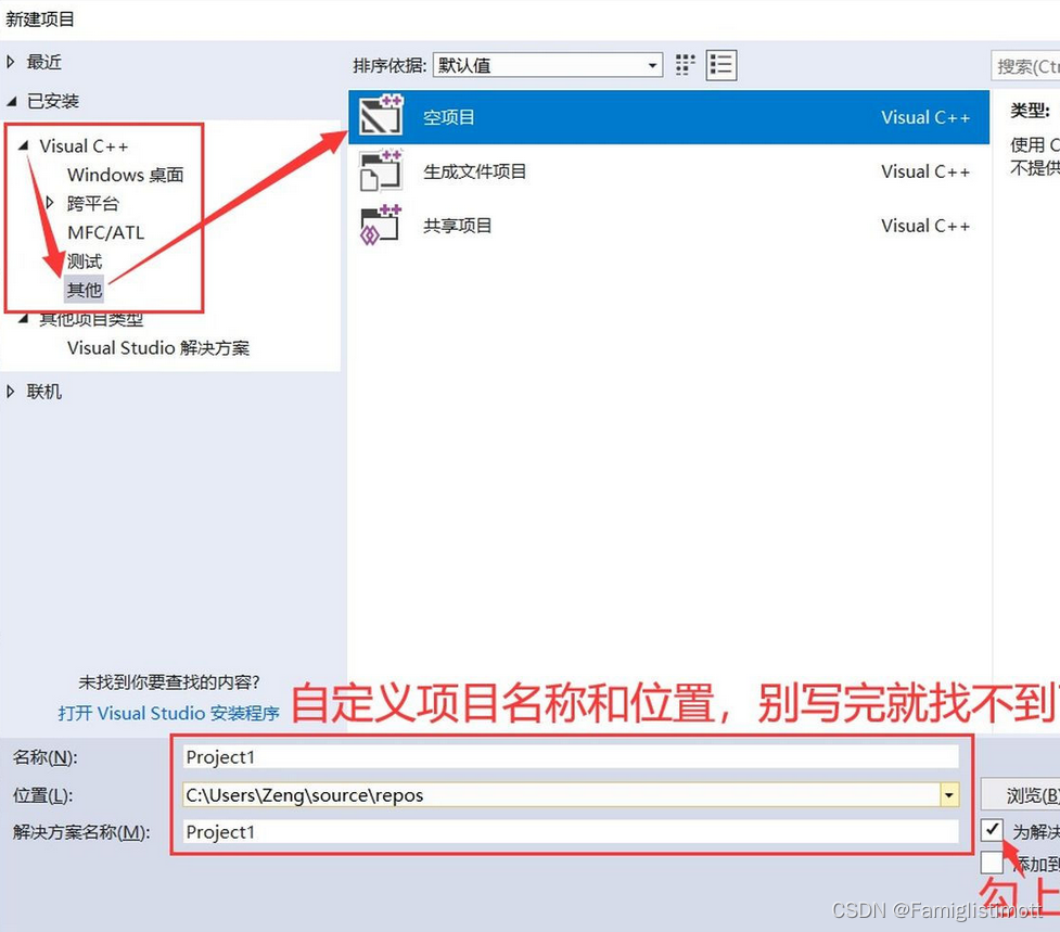 在弹出的【新建项目】对话框中,左侧有已安装可供你选择的项目类型,我们展开【Visual C++】这一栏。要编写纯C程序,建议选择【其他】→【空项目】(避免混入不需要的C++依赖)。