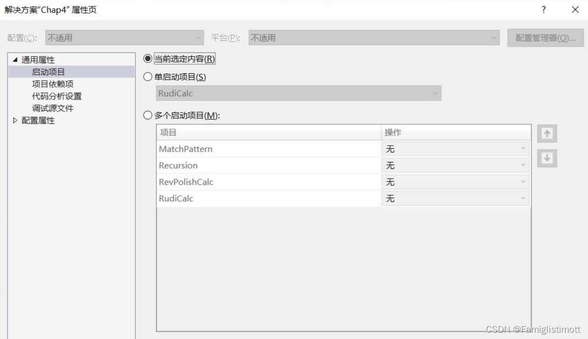 在解决方案的属性页中,选择左侧【通用属性】→【启动项目】,再选择“当前选定内容”作为启动项目。
