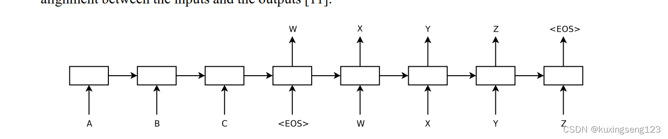Our model reads an input sentence “ABC” and produces “WXYZ” as the output sentence. The model stops making predictions after outputting the end-of-sentence token. Note that the LSTM reads the input sentence in reverse, because doing so introduces many short term dependencies in the data that make the optimization problem much easier. (使得优化问题更加容易)