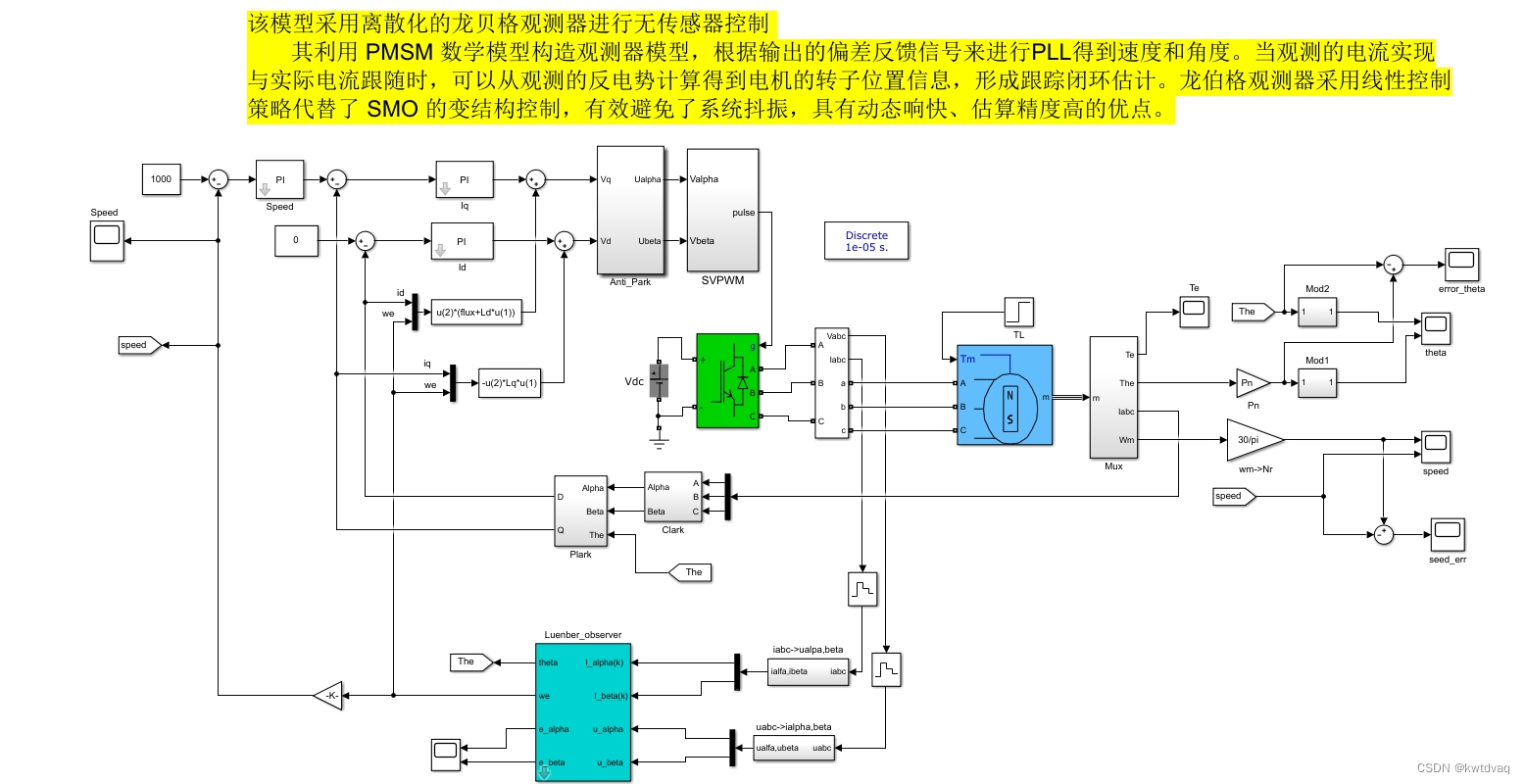 采用离散化的龙贝格观测器进行无传感器控制,龙伯格观测器采用线性控制策略代替了 SMO 的变结构控制