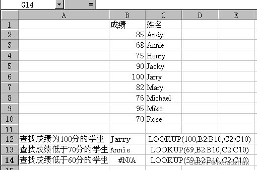 需要注意的是Lookup_vector 的数值必须按升序排序:...、-2、-1、0、1、2、...、A-Z、FALSE、TRUE;否则,函数 LOOKUP 不能返回正确的结果。文本不区分大小写。