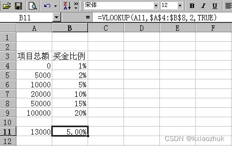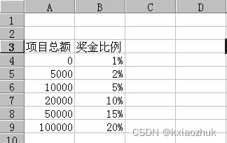 第一步,建立一个项目总额与奖金比例的对照表,如图6所示。项目总额的数字均为大于情况。即项目总额在0~5000元时,奖金比例为1%,以此类推。