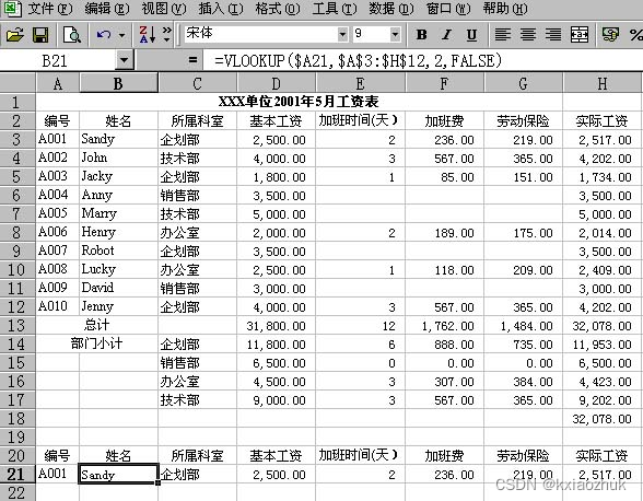 语法解释:在$A$3:$H$12范围内(即工资表中)精确找出与A21单元格相符的行,并将该行中第二列的内容计入单元格中。