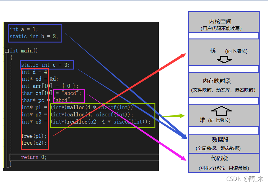 其实C/C++内存分配区域大致划分为四个区域的,分别为栈区、堆区、数据段(静态区)、代码段等,其中栈区一般存放局部变量、函数形参;堆区一般存放动态内存(malloc、calloc、free、realloc等函数操作的内存空间);数据段一般存放全局变量、静态变量(static修饰的变量)。