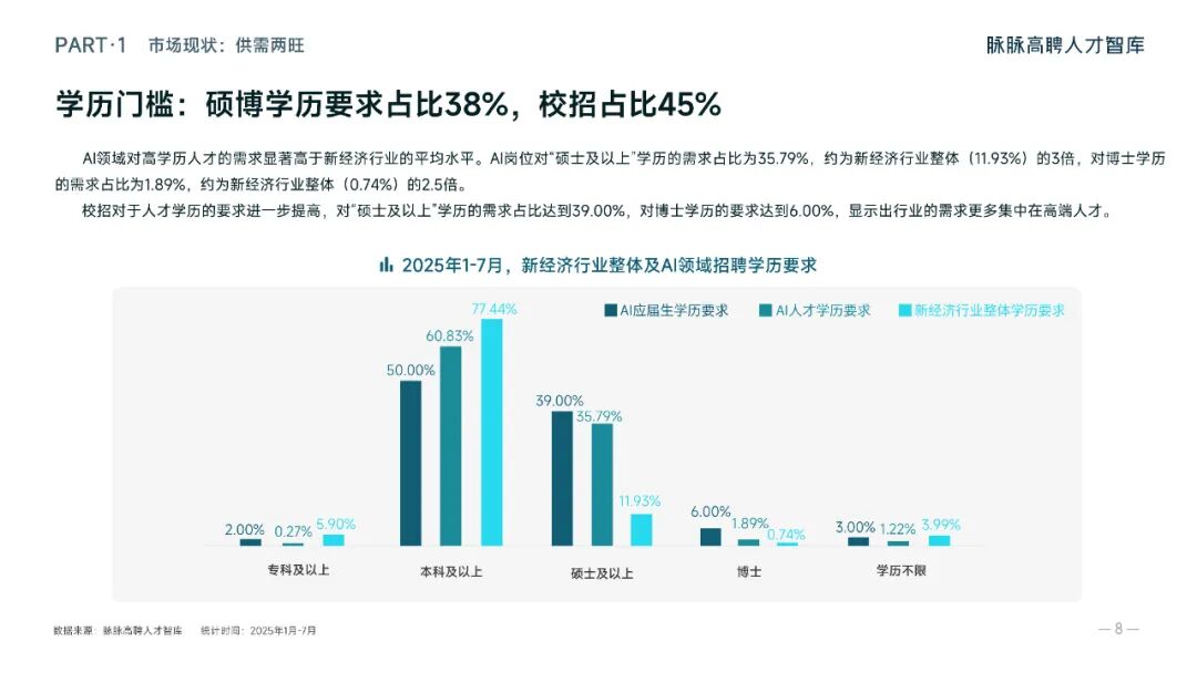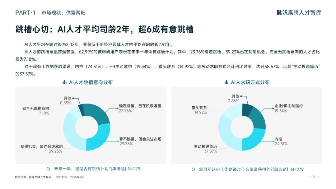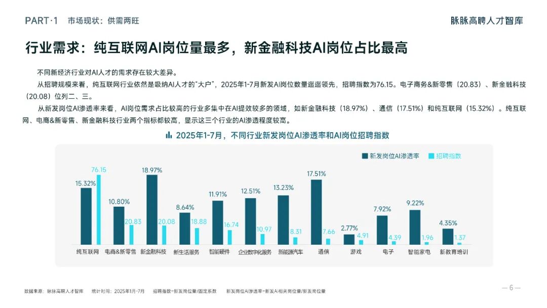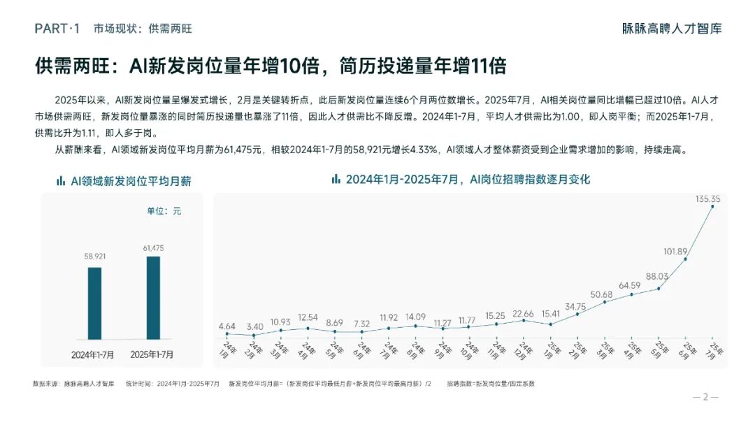 近日,脉脉发布《2025 年 AI 人才流动报告》。数据显示,2025年1-7月,AI新发岗位量同比增长超10倍,简历投递量也暴涨了11倍。“算法”相关人才持续紧缺,其中“搜索算法”人才紧缺度最高,5岗争2人。非技术岗数量同比增长7.7倍。