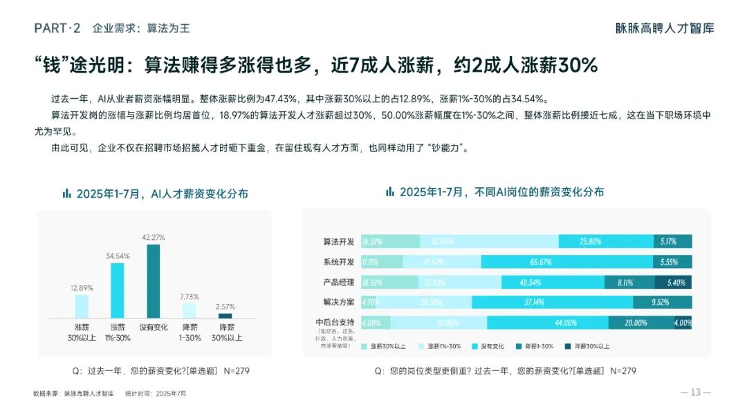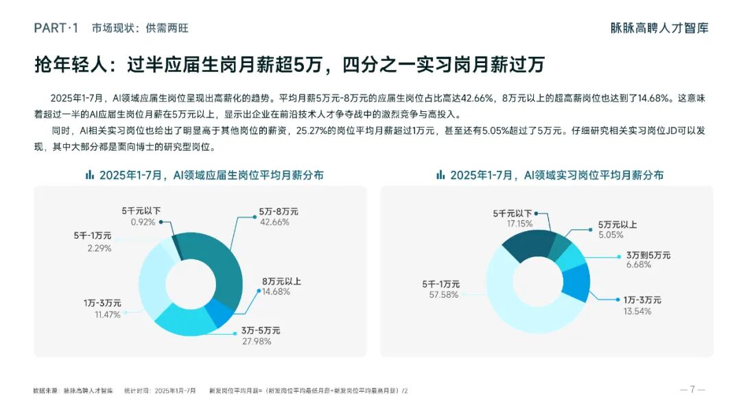 随着企业AI应用加速,非技术岗位数量也在迅速增加。2025年1-7月,AI领域新发非技术类的岗位量相比2024年同期增长7.74倍。产品、运营与设计成为非技术岗位的三大热招方向。