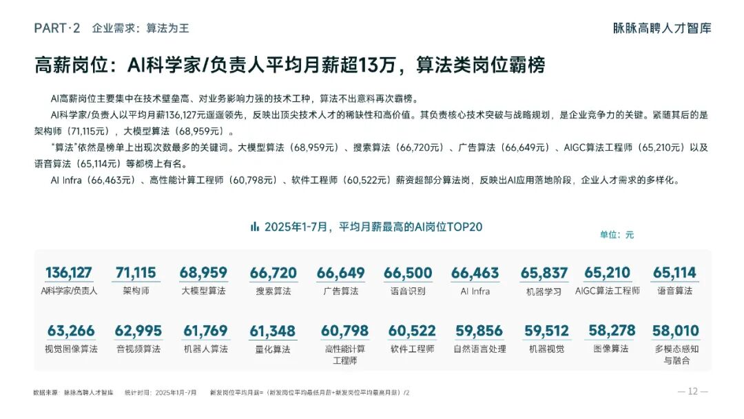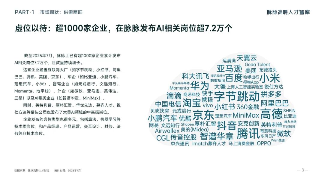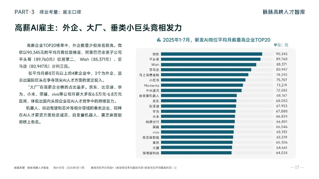 截至2025年7月,脉脉上有超1000家企业发布了7.2万个AI相关岗位,涵盖互联网大厂、外企、车企和AI垂类企业。热招企业和高薪企业均呈现大厂与垂类企业竞相发力的格局。从新发AI岗位量来看,字节跳动招聘指数29.83位列首位,小红书18.32居第二,阿里巴巴12.25位列第三。小鹏汽车、自变量机器人、黑芝麻智能等垂直企业同样上榜。