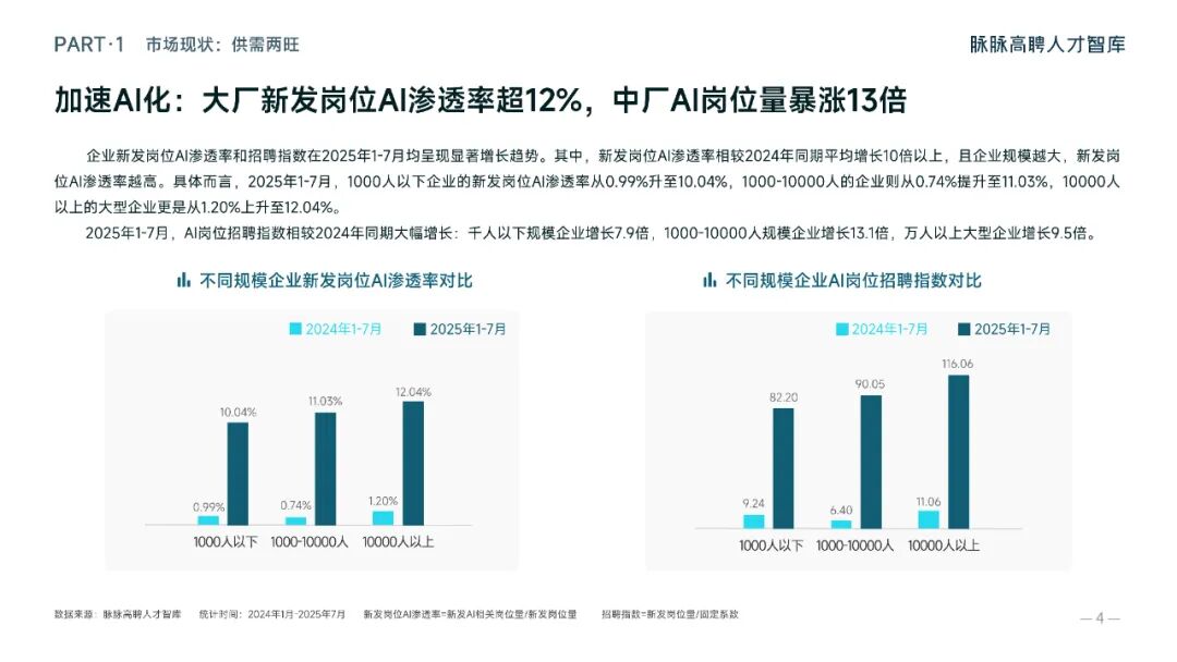 不同规模企业的AI化进程显著加速,新发岗位AI渗透率明显提升。2025年1-7月,新经济行业新发岗位AI渗透率超过10%,较去年同期提升10倍以上,且随企业规模扩大而提升。