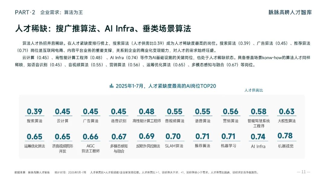 算法类岗位在AI领域招聘中占据核心地位。从热招岗位TOP20中,过半岗位与算法强相关。“大模型算法”以招聘指数94.16高居热招岗位榜首。在人才紧缺度TOP20的岗位中,“算法”岗位依然霸榜。其中,“搜索算法”成为AI领域人才稀缺度最高的岗位,人才供需比仅为0.39,相当于5个岗位争夺2个人才。