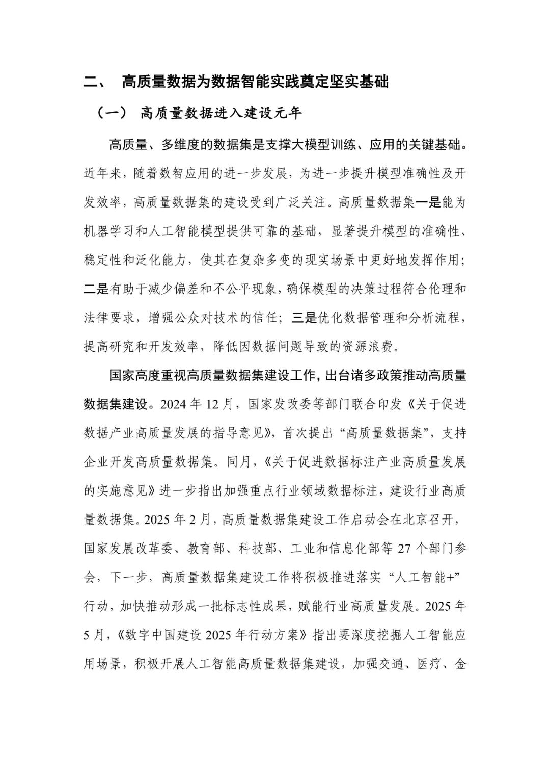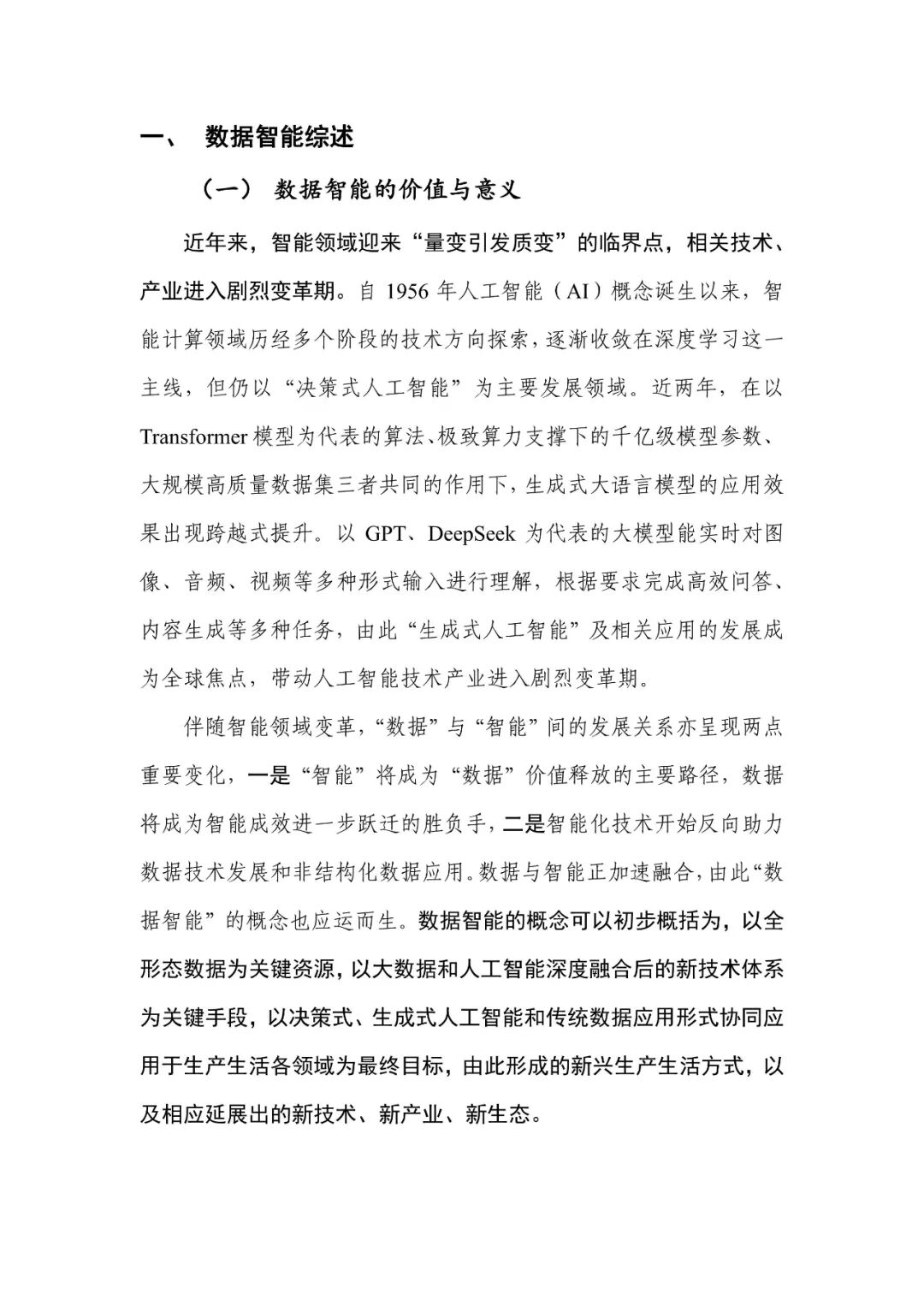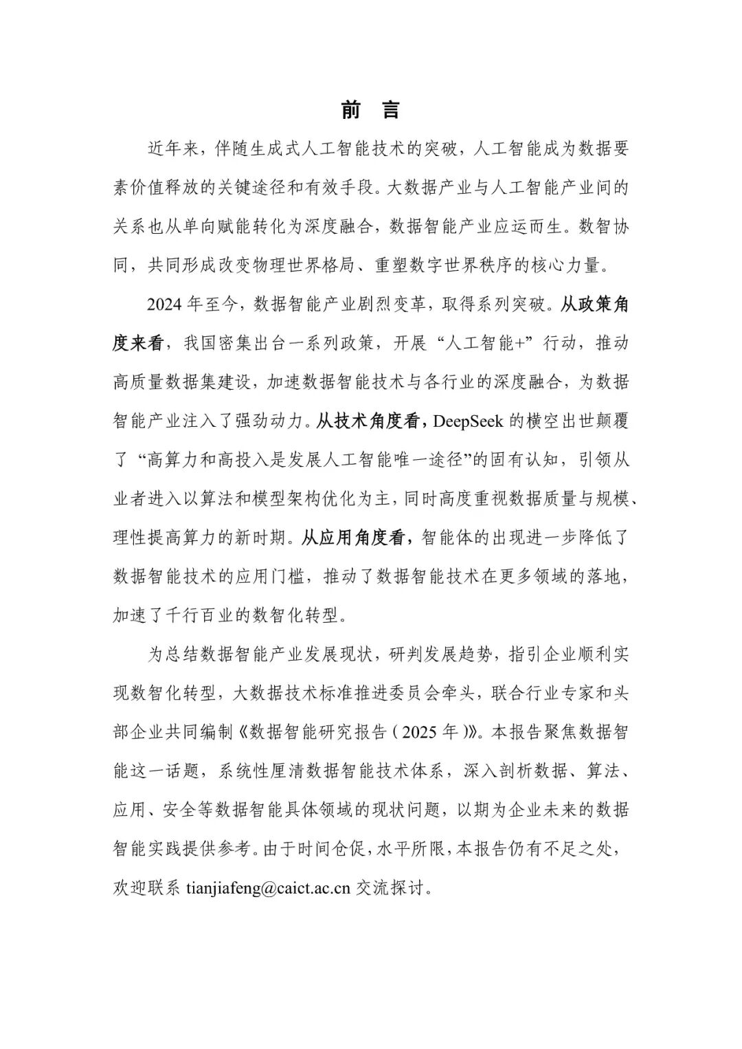 《数据智能研究报告(2025年)》旨在进一步梳理数据智能相关概念及知识体系,总结行业先进实践经验,研判数据智能领域未来发展趋势,以持续指引推动企业顺利实现数智化转型,推动数据智能产业健康有序发展。本报告是第二本数据智能领域的年度综合报告,经过对去年报告内容进一步完善和延伸,结合业界先进理念和关注焦点进行了更新和迭代。