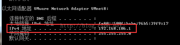 入“ipconfig”,找到VMware Network Adapter VMnet8的ipv4地址例如:192.168.106.1)