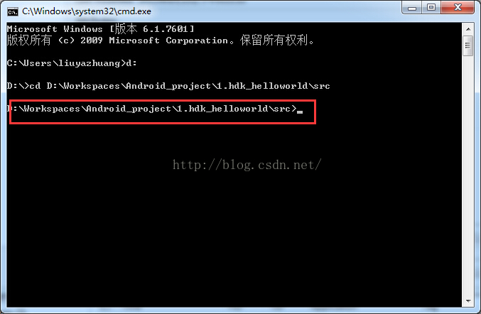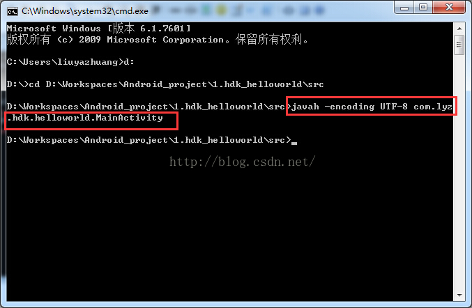 用javah命令生成,h头文件,前提是要配置好java环境变量,这里我就不说怎么配置环境变量了,相信稍微了解java的同学都知道。我们通过cmd命令行进入到MainActivity包所在的目录。