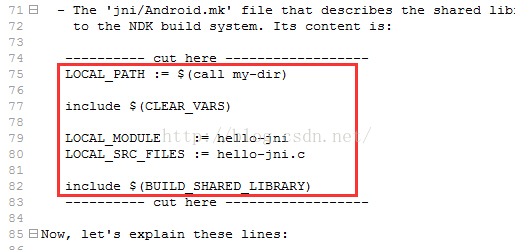 这个文件是Android实现JNI所必须的文件,而且文件名称固定为Android.mk不能更改。这个文件里的内容我们可以到ndk的docs目录下找到ANDROID-MK.html文件,打开这个文件,找到以下代码片段,拷贝到Android.mk文件中,注意要每一行不要有空格。