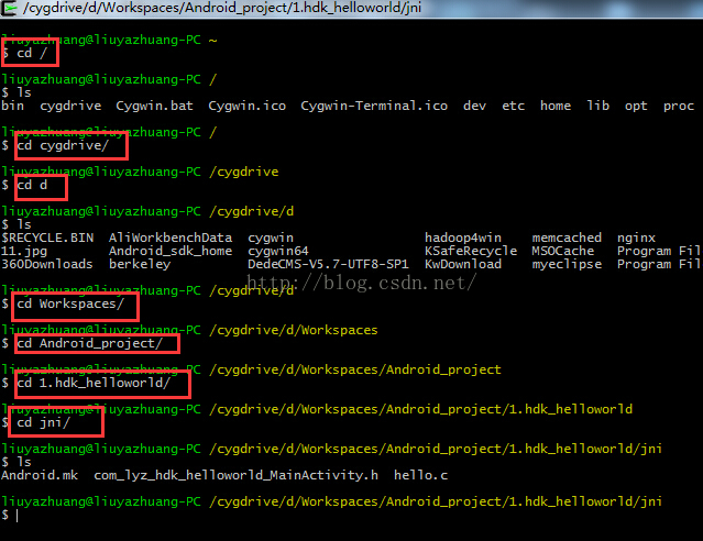 我们打开cygwin,进入到项目的jni目录下。