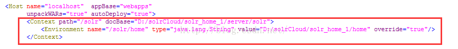 在Host节点下加入如下代码:<Context path="/solr" docBase="D:/solrCloud/solr_home_1/server/solr">