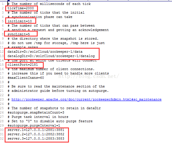 第二步:把D:\solrCloud\zookeeper-1\conf\目录下的zoo_sample.cfg修改为zoo.cfg。并写入如下的配置参数: