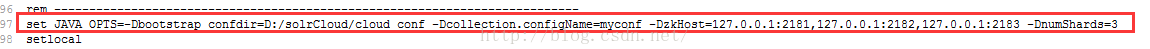 在 D:\solrCloud\tomcat7_ser1\bin\catalina.bat 文件中 , 我是在 setlocal 上一行添加:set JAVA_OPTS=-Dbootstrap_confdir=D:/solrCloud/cloud_conf -Dcollection.configName=myconf -DzkHost=127.0.0.1:2181,127.0.0.1:2182,127.0.0.1:2183 -DnumShards=3