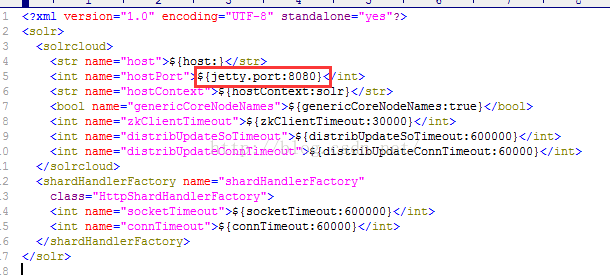 第三步: 因为配置由zookeeper统一管理了,所以home下面的solr配置就不起作用了。删除D:\solrCloud\solr_home_*\home\solr文件夹, 修改配置solr.xml,如下图