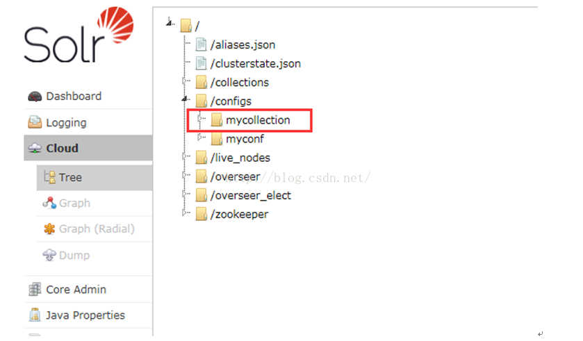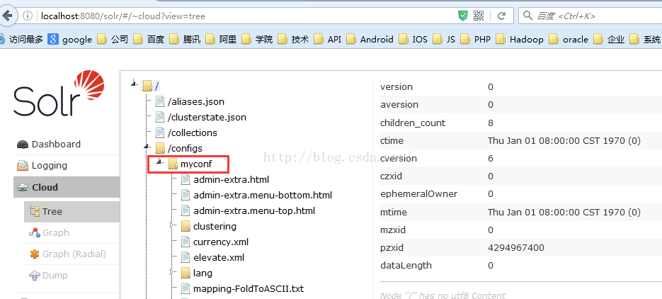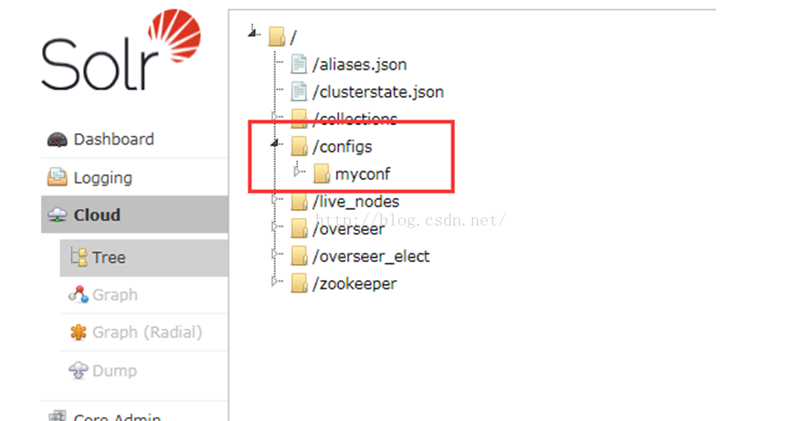 我们可以看下Cloud 的 Tree 下面就可以看到我们上传的配置文件,我上传时 -Dcollection.configName=myconf 所以这里也是显示 myconf 。