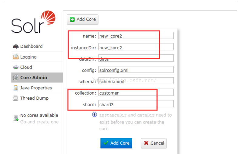 答:输入 name , instanceDir, collection, shard,点击AddCore。 说明下,当collection 名称样的core 索引是通用的。(反之collection不一样则索引之前不可相互访问了)