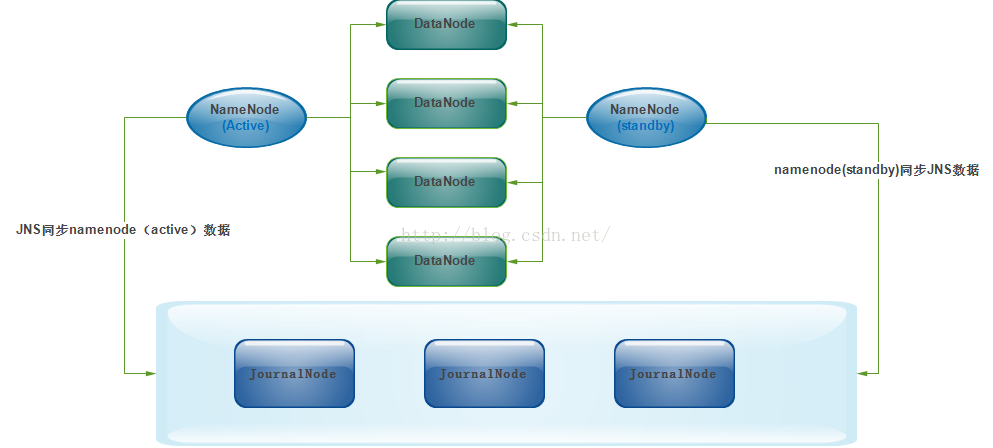 两个NameNode为了数据同步,会通过一组称作JournalNodes的独立进程进行相互通信。当active状态的NameNode的命名空间有任何修改时,会告知大部分的JournalNodes进程。standby状态的NameNode有能力读取JNs中的变更信息,并且一直监控edit log的变化,把变化应用于自己的命名空间。standby可以确保在集群出错时,命名空间状态已经完全同步了