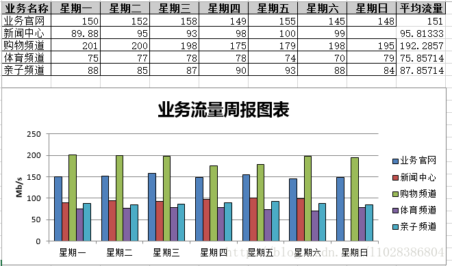 对于企业生产环境来说,监控服务器的流量数据至关重要,那么如何通过流量数据来生成相应的流量报表呢?本实例通过定制网站5个频道的流量报表周报,通过XlsxWriter模块将流量数据写入Excel文档,同时自动计算各频道周平均流量,再生成数据图表。同时,可结合邮件发送模块将生成的报表发送到指定人员的邮箱当中,这里我们专注于利用Python生成流量报表,如何发送邮件请大家自行整合,同时,本实例是模拟的流量数据,大家可以将数据替换成自己服务器真实的流量数据。