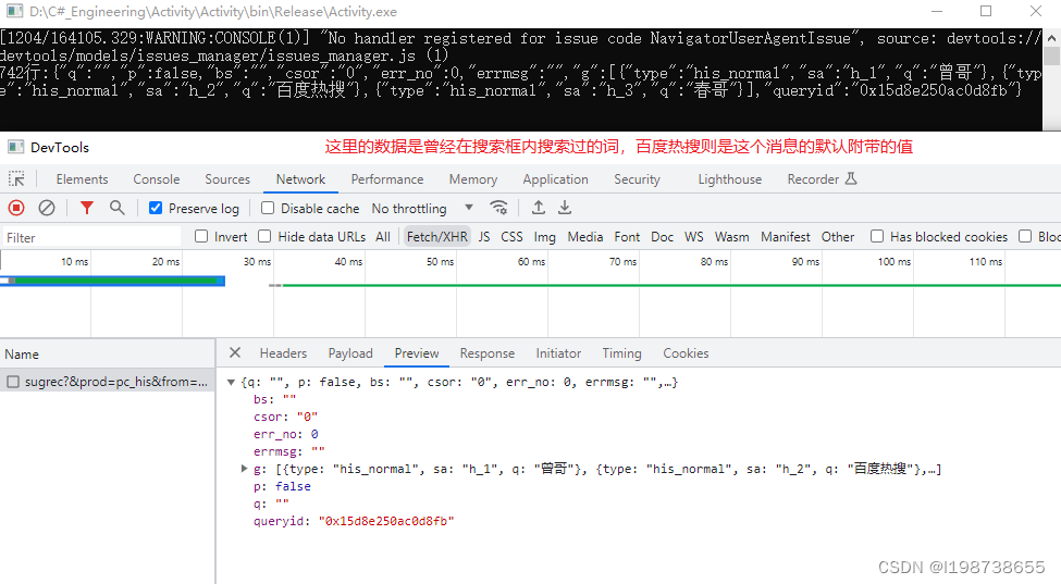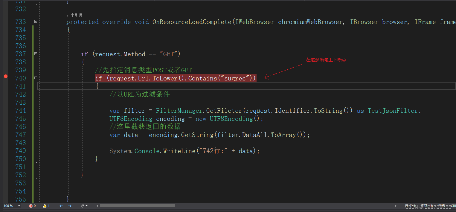 然后重写IResponseFilter、OnResourceLoadComplete两个接口,在OnResourceLoadComplete接口中就能接收返回值了。返回值会返回到函数的request参数下,此参数是一个结构体,可以自行在 if (request.Url.ToLower().Contains("sugrec")) 这一句上下断点查看结构体的内容,然后自行加判断来过滤返回值,这里鄙人先判断发送类型为GET消息,然后再根据发送消息URL里的关键字来过滤返回值,最后显示到WinForm窗口程序绑定的控制台窗口里。