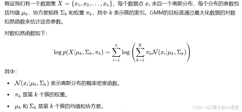 - M步骤(最大化步骤):根据后验概率更新模型的参数(均值、协方差、权重)。