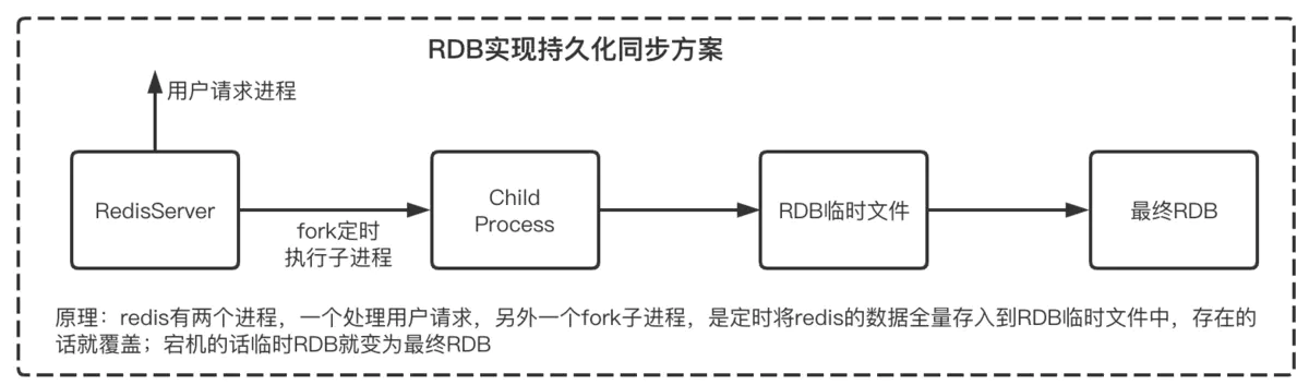 Redis主进程fork一个子进程来创建临时RDB存储文件,创建文件完成后对这个临时文件rename替换原先的RDB文件。