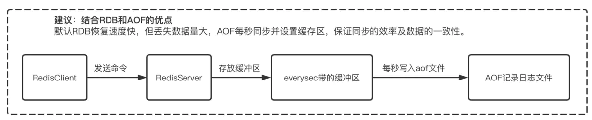 建议最好还是搭配使用aof的everysec,既能够保证数据的同步,效率也还可以,但是会存在丢失一秒数据的可能性,就算丢失也关系不大,因为数据库中已经存在了数据。