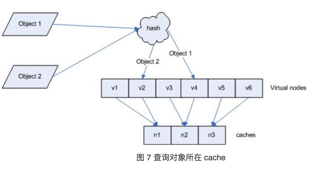 引入“虚拟节点”后,映射关系就从 { 对象 -> 节点 } 转换到了 { 对象 -> 虚拟节点 } 。查询物体所在 cache 时的映射关系