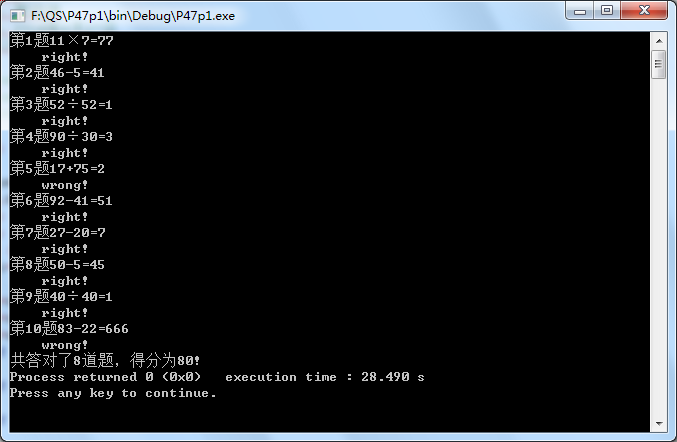 练习者根据显示的题目输入自己的答案,程序自动判断输入的答案是否正确并显示出相应的信息