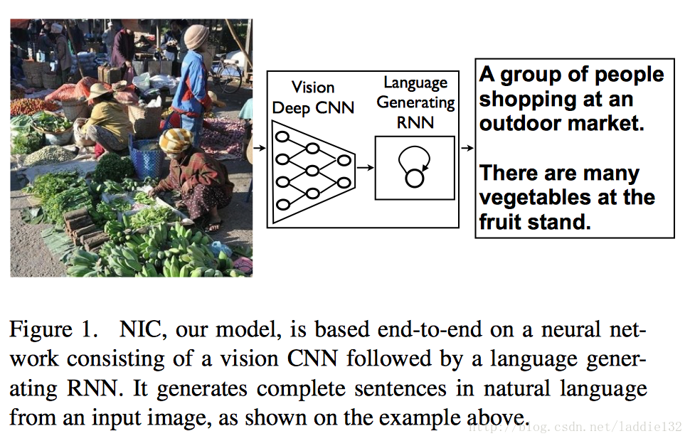 上图便是作者的模型Neural Image Caption(NIC),使用一个cnn网络作为图像编码器,并在物体识别任务中预训练参数,将最后一个隐含层输入到RNN解码器中。