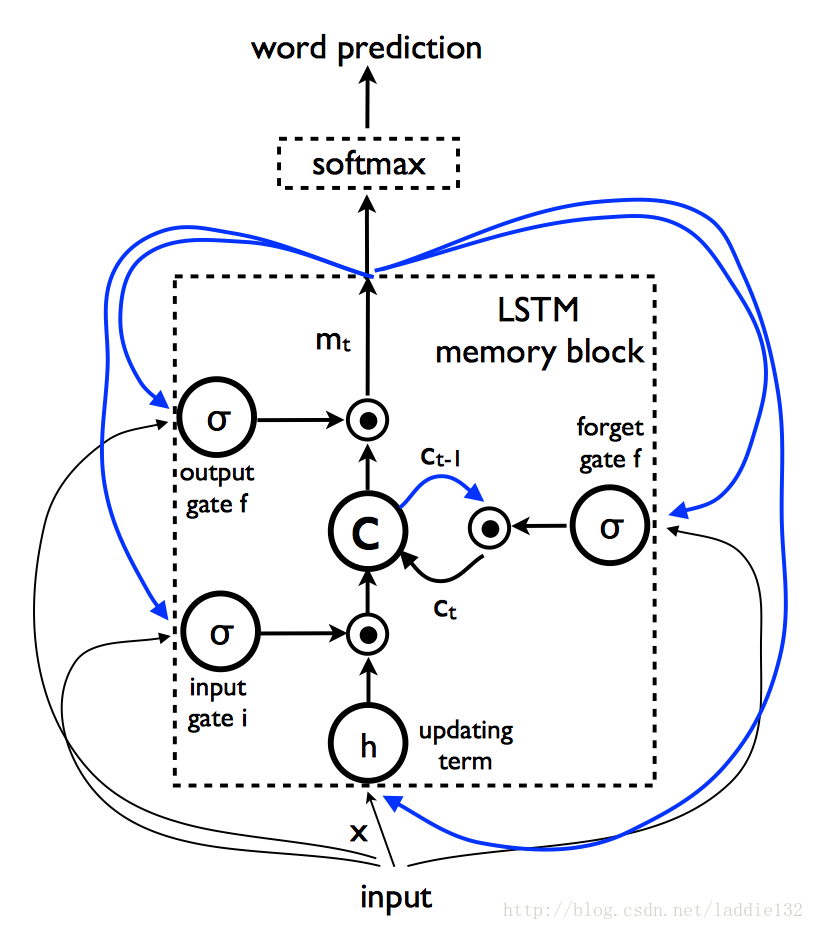 其中, i i 代表输入门,代表遗忘门, o o 代表输出门,代表记忆状态, m m 代表输出值