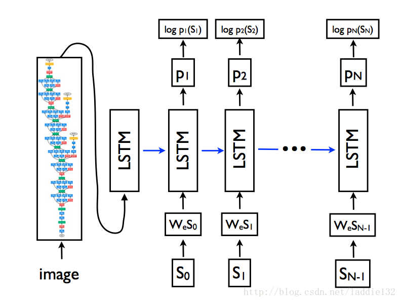 即对于输入图像 I I ,输出句子的概率为每一时刻生成对应词 St S t 概率的乘积,如果取对数概率,则分解为每一时刻词对数概率的和。