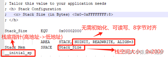 启动文件(.s)中主程序栈(stack)空间分配:
