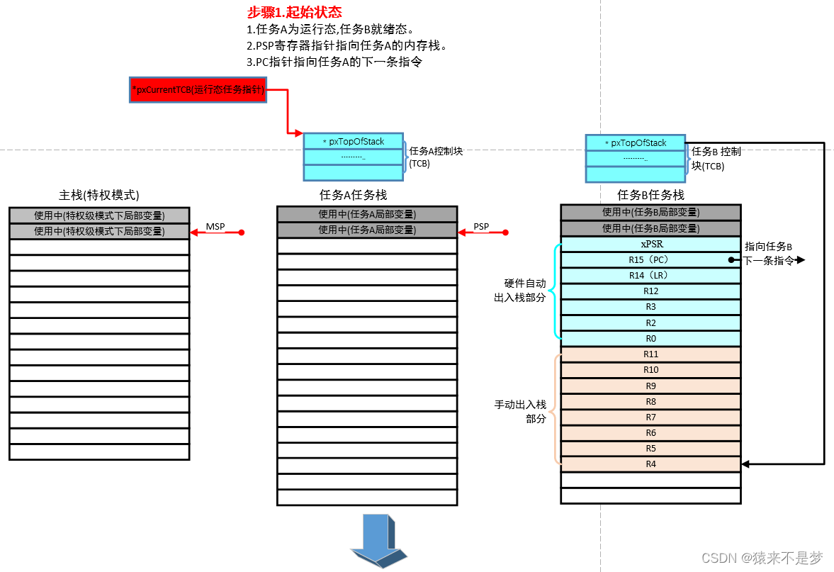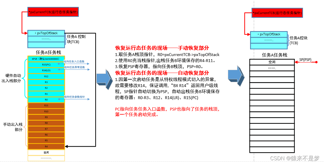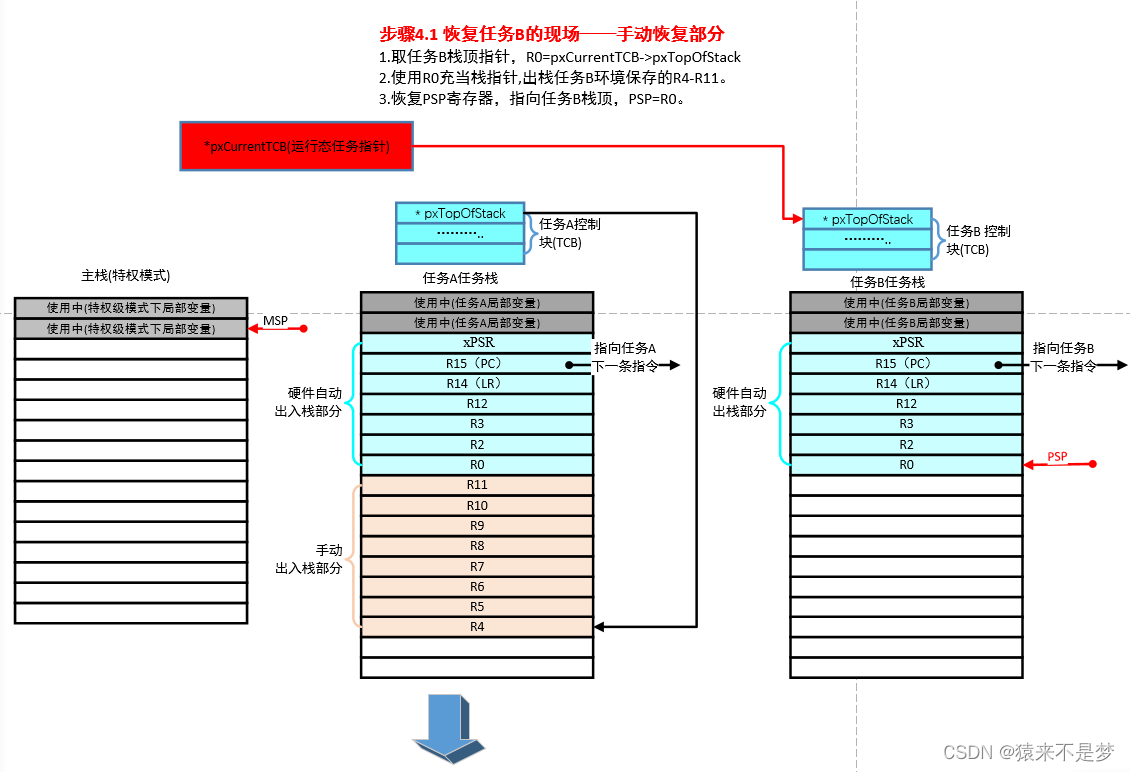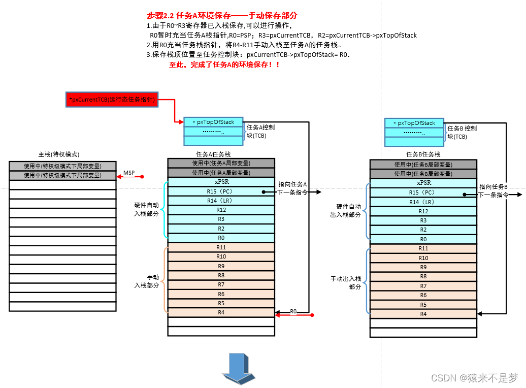 由上图可见,对比切换前和切换后,任务A和任务B的栈状态正好相反,任务A进行了环境保存,任务B进行了环境恢复。