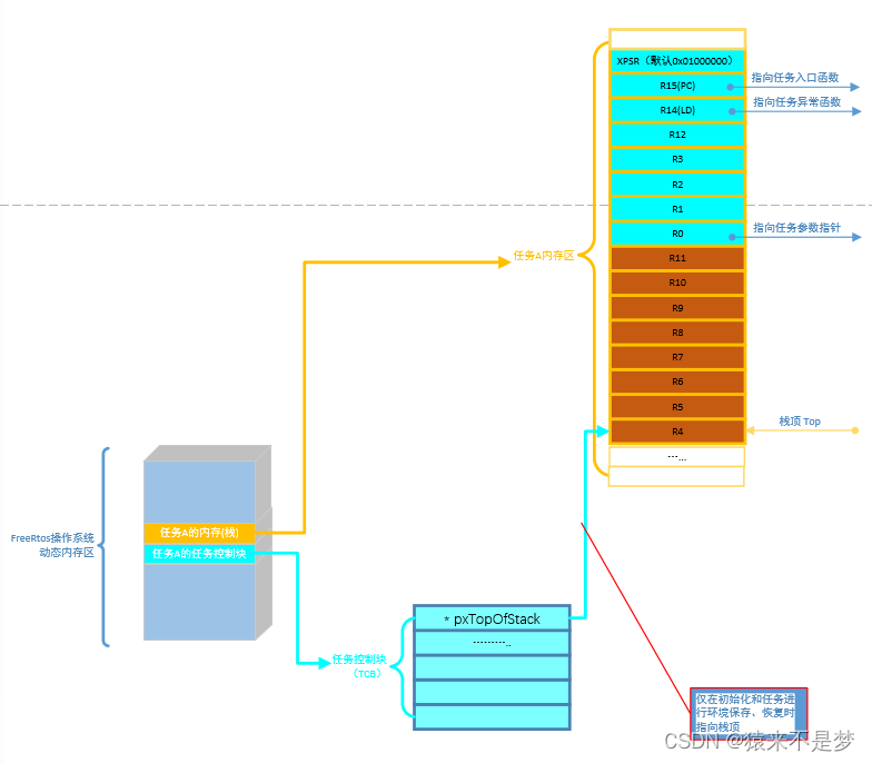 注2:任务初始化会将环境恢复数据初始值入栈。