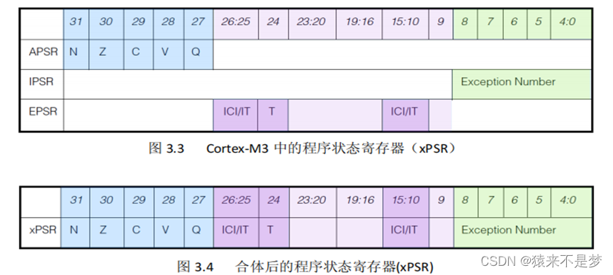 状态字寄存器组包括:应用程序 PSR(APSR)、 中断号 PSR(IPSR)、执行 PSR(EPSR),环境保存时是三个寄存器会合并为一个32位xPSR进行保存。