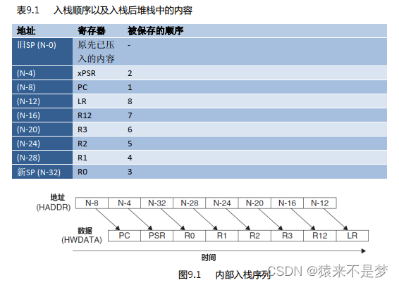 与一些高端内核不同,CM3由线程模式(Thread)进入handler模式会自动进行部分寄存器的入栈保存,下图参考自《CM3权威指南CnR2 宋岩 译》: