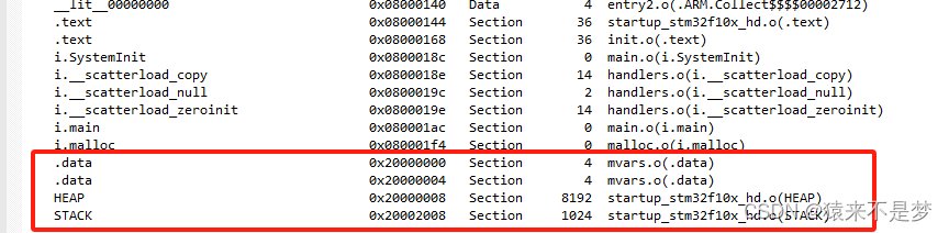 | heap | 读/写 | 无 | SRAM (运行中分配) | 堆区:使用编译器微库,用于malloc申请动态内存。 | |