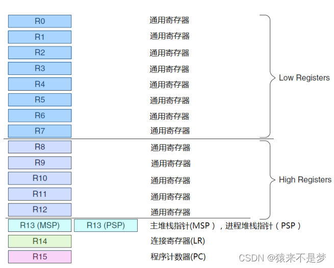 R0-R12 都是 32 位通用寄存器,用于数据操作、暂存。绝大多数 16 位 Thumb 指令只能访问 R0-R7,而 32 位 Thumb-2 指令可以访问所有寄存器。