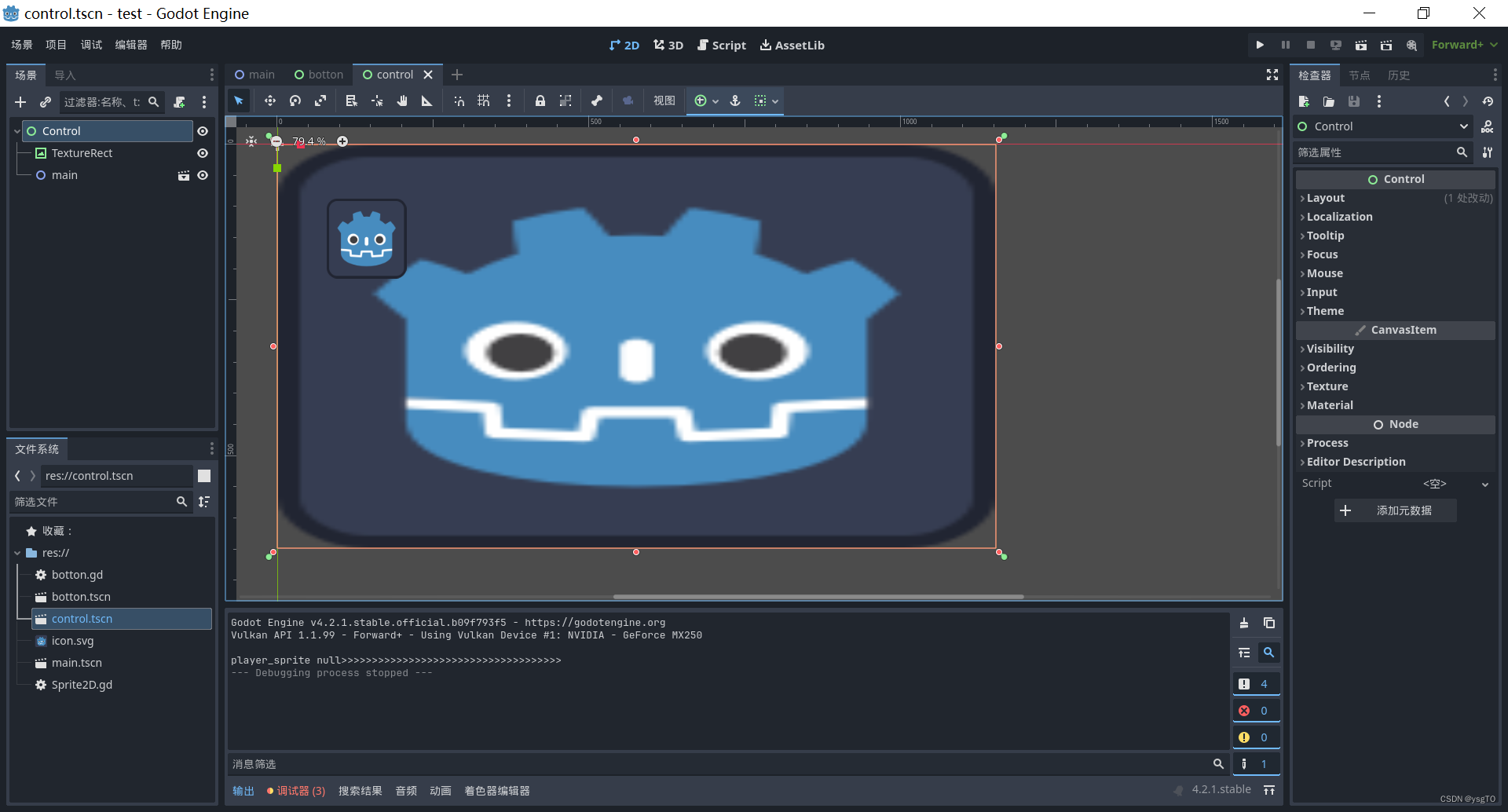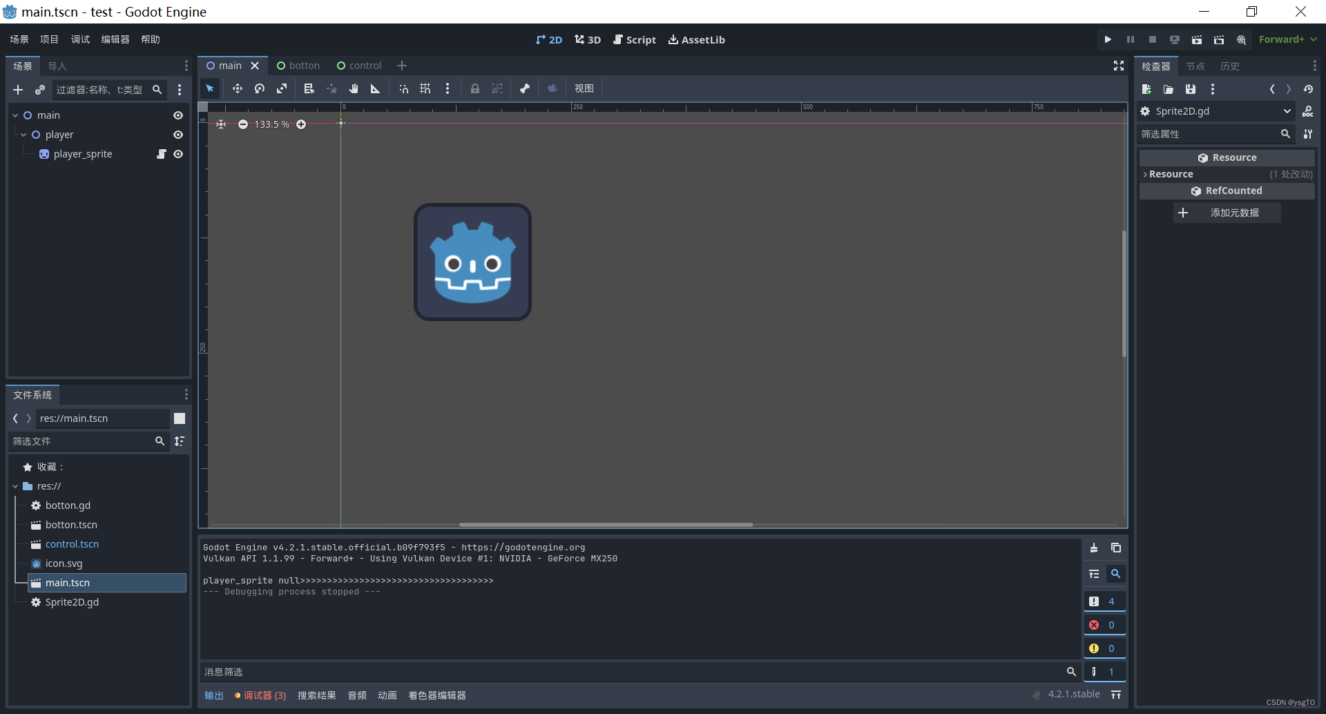 2、@onready var player_sprite = $player_sprite:这个拿到的是null,不知道为什么:为什么是null,因为$是在子节点里找child,我们加脚本应该在node2d里加,不应该在sprite2d里加