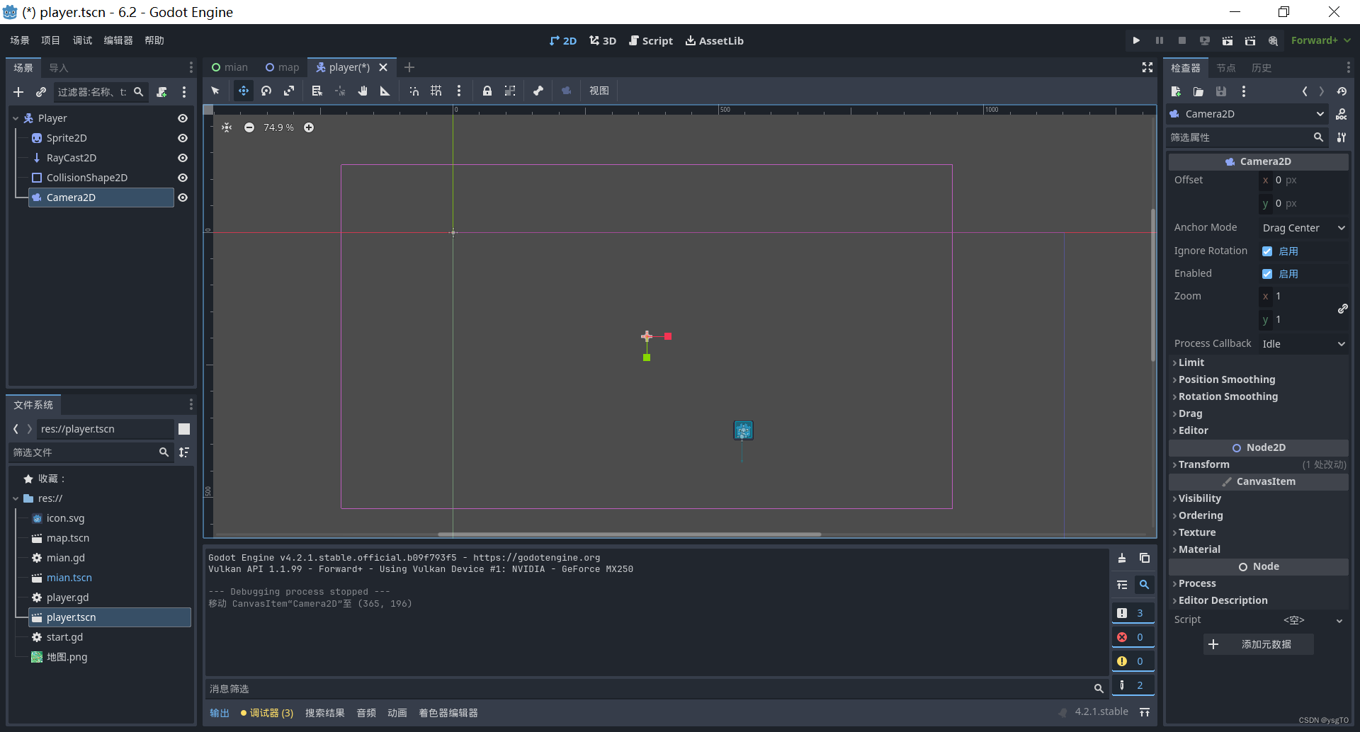 2.直接在player节点下面挂一个相机,并且把相机和屏幕放到一起,就会跟随角色,zoom越大,相机越小
