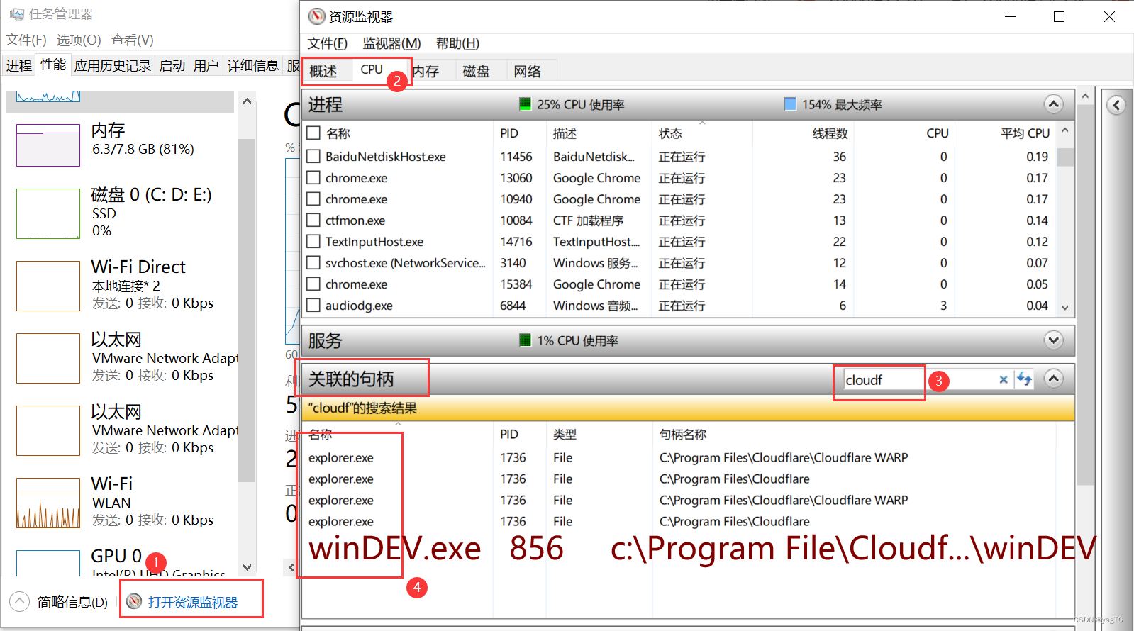 如果发现只有explorer.exe,那肯定是不对的,我们先。1.找到句柄:ctrl alt del打开任务资源管理器。2.注意是选择CPU -> 关联的句柄,而不是概述。,发现哪个删不掉,再在这里找句柄,找到之后,4.把explorer.exe删除了怎么办。删掉之后,快速删除刚才那个删不掉的文件。shfit一个一个删除。