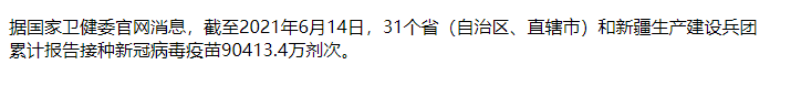 <p>据国家卫健委官网消息,截至2021年6月14日,31个省(自治区、直辖市)和新疆生产建设兵团<br/>累计报告接种新冠病毒疫苗90413.4万剂次。</p>