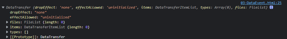 DataTransfer 对象用于保存拖动并放下(drag and drop)过程中的数据,用于从被拖动元素向放置目标传递字符串数据