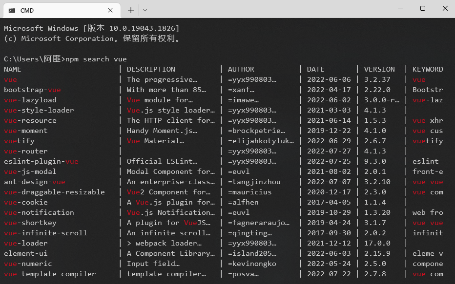 npm search 命令用于搜索npm仓库,它后面可以跟字符串,也可以跟正则表达式